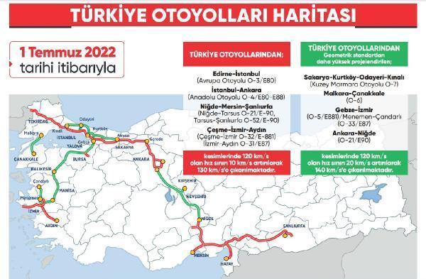 Bu doğrultuda Ulaştırma ve Altyapı Bakanlığı'nın da uygun görüşüyle birlikte 1 Temmuz’dan itibaren otomobiller için otoyollarda yeni hız sınırı uygulamasına başlanacak. Bu tarihten itibaren Edirne-İstanbul (Avrupa otoyolu), İstanbul-Ankara (Anadolu Otoyolu), Niğde-Mersin-Şanlıurfa (Niğde- Tarsus kesimi, Tarsus-Şanlıurfa kesimi) ile Çeşme-İzmir-Aydın (Çeşme-İzmir kesimi ile İzmir-Aydın kesimleri) otoyollarının mevcut olan 120 kilometre/saat olan hız sınırı 10 kilometre/saat artırılarak 130 kilometre/saate, Kuzey Marmara otoyolunun Sakarya-Kurtköy-Odayeri-Kınalı bölümü, Malkara-Çanakkale, Gebze-İzmir/Menemen-Çandarlı, Ankara-Niğde otoyollarında ise 120 kilometre/saat olan hız sınırı 20 kilometre/saat artırılarak 140 kilometre/saate çıkarılacak.