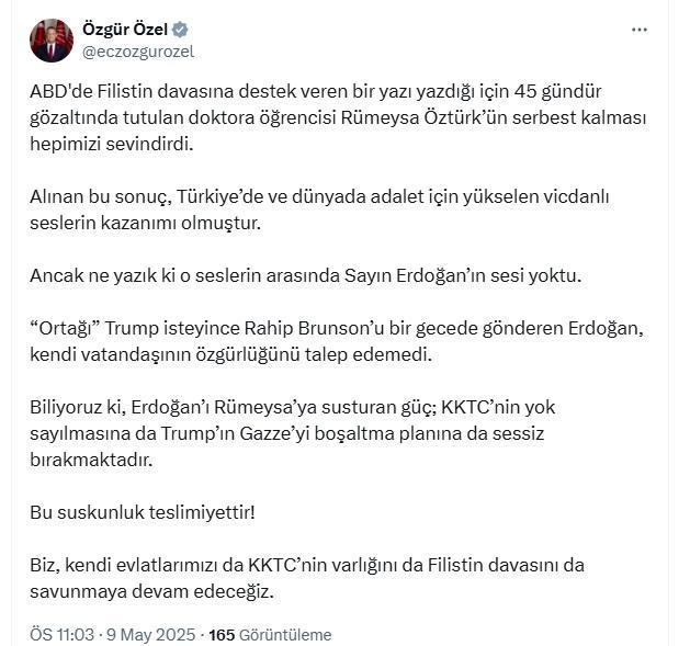 CHP Genel Başkanı Özgür Özel, sosyal medya hesabından paylaşım yaparak, “ABD'de Filistin davasına destek veren bir yazı yazdığı için 45 gündür gözaltında tutulan doktora öğrencisi Rümeysa Öztürk’ün serbest kalması hepimizi sevindirdi. Alınan bu sonuç, Türkiye’de ve dünyada adalet için yükselen vicdanlı seslerin kazanımı olmuştur. Ancak ne yazık ki o seslerin arasında Sayın Erdoğan’ın sesi yoktu. “Ortağı” Trump isteyince Rahip Brunson’u bir gecede gönderen Erdoğan, kendi vatandaşının özgürlüğünü talep edemedi. Biliyoruz ki, Erdoğan’ı Rümeysa’ya susturan güç; KKTC’nin yok sayılmasına da Trump’ın Gazze’yi boşaltma planına da sessiz bırakmaktadır. Bu suskunluk teslimiyettir. Biz, kendi evlatlarımızı da KKTC’nin varlığını da Filistin davasını da savunmaya devam edeceğiz” ifadelerini kullandı. (DHA)