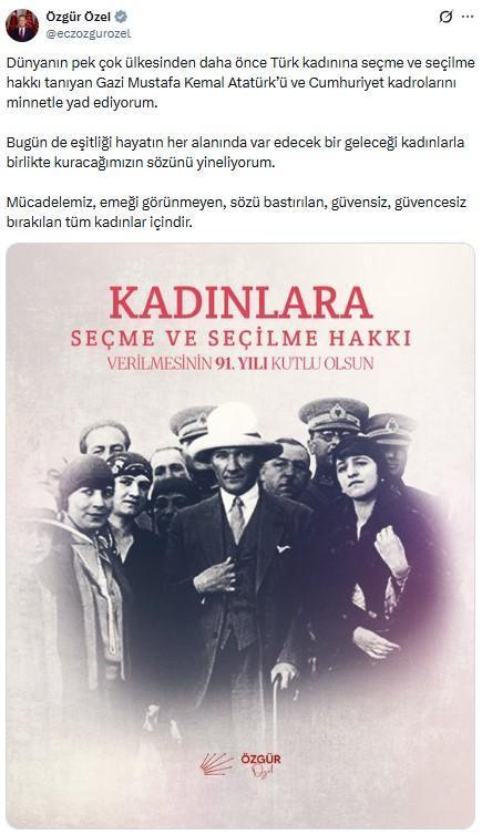 ANKARA, (DHA)- CHP Genel Başkanı Özgür Özel, Türk kadınının seçme ve seçilme hakkını elde edişinin 91'inci yıl dönümü kutladı.