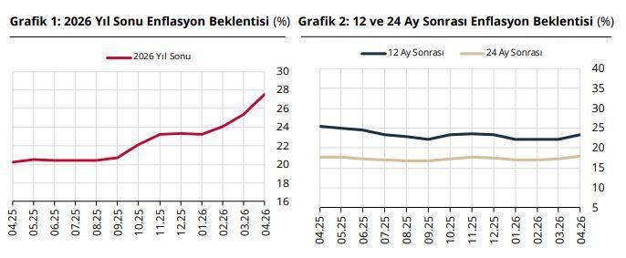 TCMB, Nisan 2026 dönemine ilişkin Piyasa Katılımcıları Anketi verilerini açıkladı. Buna göre; katılımcıların cari yıl sonu tüketici enflasyonu beklentisi bir önceki anket döneminde yüzde 25,38 iken, bu anket döneminde yüzde 27,53 oldu. 12 ay sonrası TÜFE beklentisi bir önceki anket döneminde yüzde 22,17 iken, bu anket döneminde yüzde 23,39 oldu. 24 ay sonrası TÜFE beklentisi ise bir önceki anket döneminde yüzde 17,30 iken, bu anket döneminde yüzde 18,02 olarak gerçekleşti.