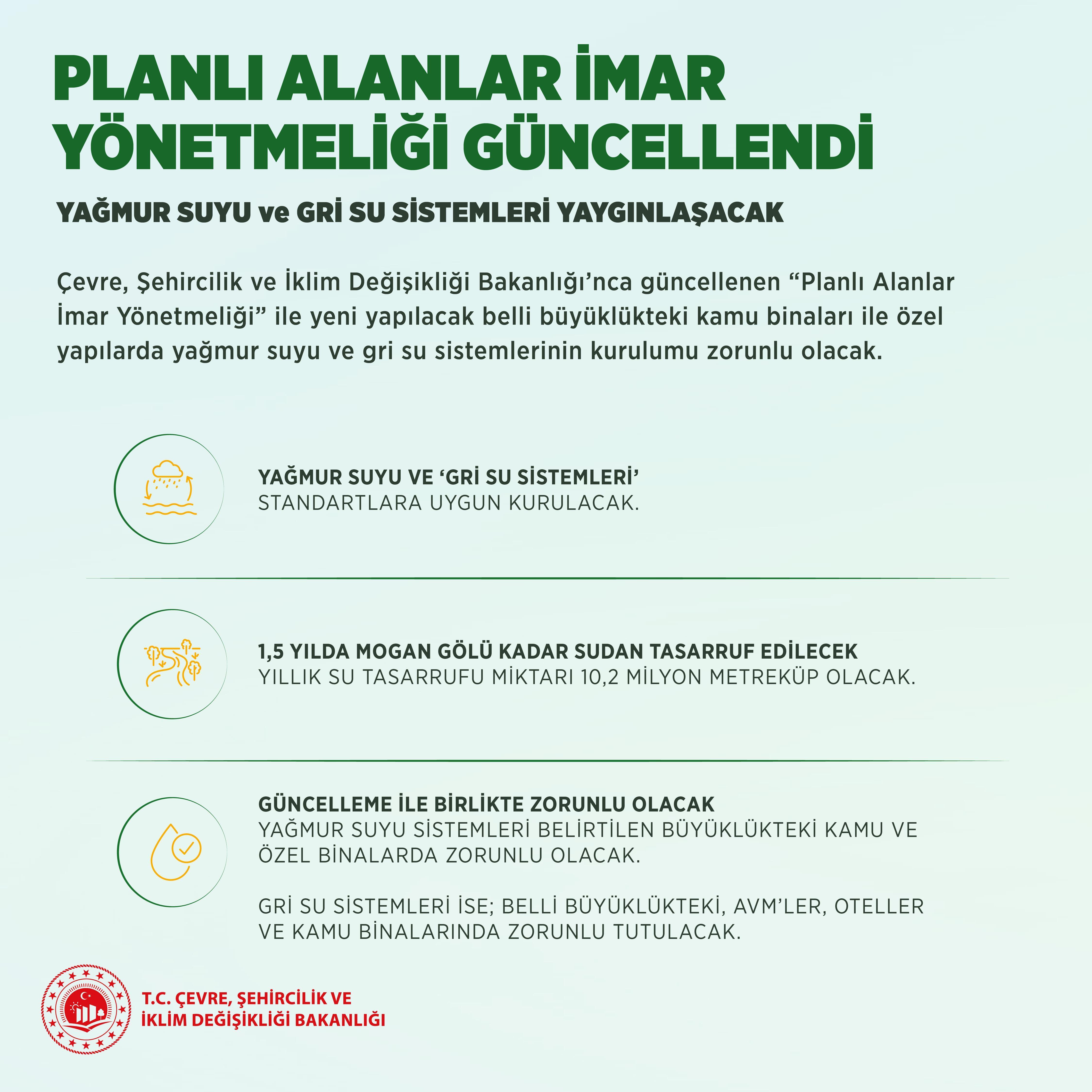 Çevre, Şehircilik ve İklim Değişikliği Bakanlığı'ndan yapılan açıklamaya göre, Mesleki Hizmetler Genel Müdürlüğü tarafından hazırlanan 'Planlı Alanlar İmar Yönetmeliği'nde değişiklik yapıldı. Resmi Gazete'de yayımlanarak yürürlüğe giren yönetmelikle, binalarda yağmur suyu ve gri su kullanımından 'Yeşil Sertifika'ya, elektrikli araçlar için kurulacak şarj ünitelerinden engelsiz çocuk oyun alanlarına kadar pek çok başlıkta düzenleme yapıldı. Yönetmelikte 1 Ocak 2026'dan sonra yapılacak belli büyüklük ve tipteki özel ve kamu binalarında yağmur suyu ve gri su sistemlerinin kurulumu zorunlu olacak. Filtreden geçirilen yağmur suyu, bahçe sulaması ve tuvalet rezervuarlarında kullanılacak. Yağmur suyu sistemi, depo hacmi 7 metreküpün üzerinde olan parsel alanı 2 bin metrekareden büyük alanlardaki yapılar, parseldeki çatı iz düşümü alanı 1000 metrekareden büyük özel yapılar ve kamu binalarında zorunlu olacak. Bu sayede binalarda yıllık ortalama 6,2 milyon metreküp su tasarrufu sağlanacak.
