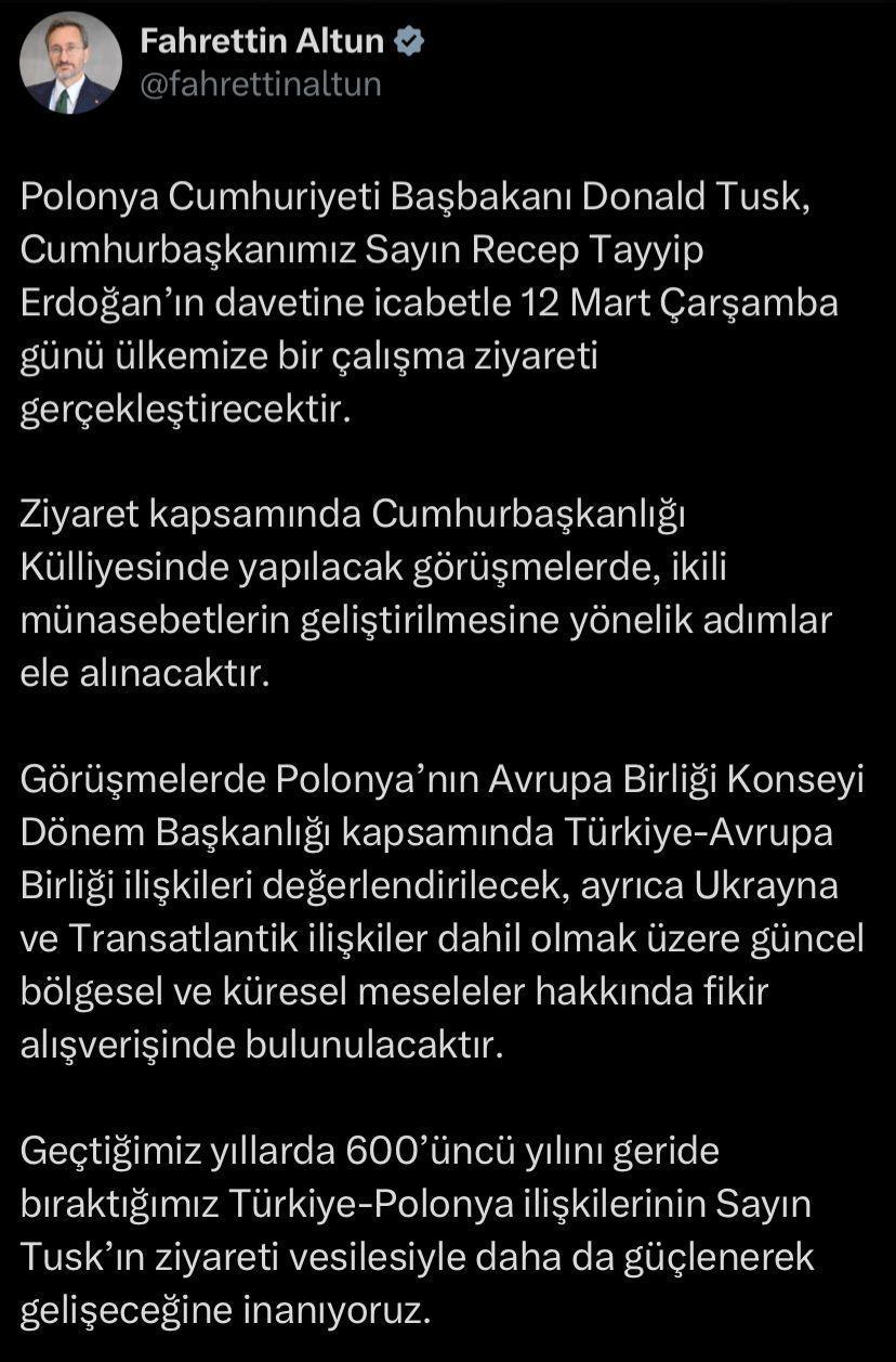 İletişim Başkanı Fahrettin Altun, sosyal medya hesabından yaptığı açıklamada, "Polonya Cumhuriyeti Başbakanı Donald Tusk, Cumhurbaşkanımız Sayın Recep Tayyip Erdoğan'ın davetine icabetle 12 Mart Çarşamba günü ülkemize bir çalışma ziyareti gerçekleştirecektir. Ziyaret kapsamında Cumhurbaşkanlığı Külliyesi'nde yapılacak görüşmelerde, ikili münasebetlerin geliştirilmesine yönelik adımlar ele alınacaktır. Görüşmelerde Polonya'nın Avrupa Birliği Konseyi Dönem Başkanlığı kapsamında Türkiye-Avrupa Birliği ilişkileri değerlendirilecek, ayrıca Ukrayna ve transatlantik ilişkiler dahil olmak üzere güncel bölgesel ve küresel meseleler hakkında fikir alışverişinde bulunulacaktır. Geçtiğimiz yıllarda 600'üncü yılını geride bıraktığımız Türkiye-Polonya ilişkilerinin Sayın Tusk'ın ziyareti vesilesiyle daha da güçlenerek gelişeceğine inanıyoruz" ifadelerini kullandı. (DHA)