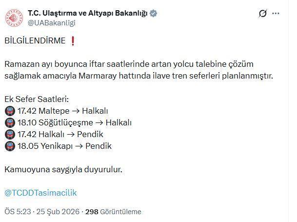 ANKARA, (DHA)- ULAŞTIRMA ve Altyapı Bakanlığı, Ramazan ayı boyunca iftar saatlerinde artan yolcu talebine çözüm sağlamak amacıyla planlanan Marmaray hattına eklenen tren seferlerini paylaştı.