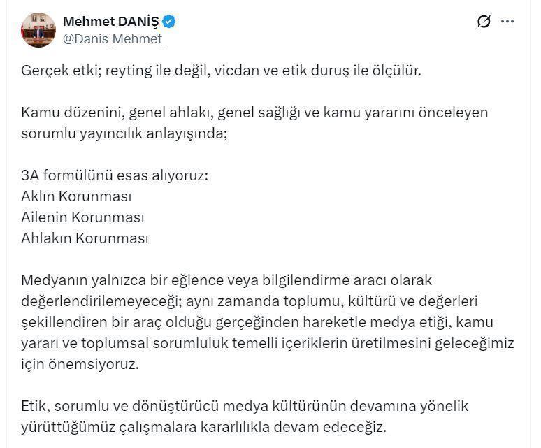 RTÜK Başkanı Daniş, sanal medya hesabından yaptığı açıklamada, "Gerçek etki; reyting ile değil, vicdan ve etik duruş ile ölçülür. Kamu düzenini, genel ahlakı, genel sağlığı ve kamu yararını önceleyen sorumlu yayıncılık anlayışında; 3A formülünü esas alıyoruz: Aklın korunması, ailenin korunması, ahlakın korunması. Medyanın yalnızca bir eğlence veya bilgilendirme aracı olarak değerlendirilemeyeceği; aynı zamanda toplumu, kültürü ve değerleri şekillendiren bir araç olduğu gerçeğinden hareketle medya etiği, kamu yararı ve toplumsal sorumluluk temelli içeriklerin üretilmesini geleceğimiz için önemsiyoruz. Etik, sorumlu ve dönüştürücü medya kültürünün devamına yönelik yürüttüğümüz çalışmalara kararlılıkla devam edeceğiz" ifadelerini kullandı. (DHA)