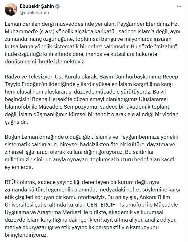 RTÜK Başkanı Ebubekir Şahin, sosyal medya hesabından yaptığı açıklamada, "Leman denilen dergi müsveddesinde yer alan, Peygamber Efendimiz Hz. Muhammed'e (s.a.v.) yönelik alçakça karikatür, sadece İslam'a değil, aynı zamanda inanç özgürlüğüne, toplumsal barışa ve milyonlarca insanın kutsallarına yönelik sistematik bir nefret saldırısıdır. Bu sözde mizahın, ifade özgürlüğü kılıfı altında dine, inanca ve kutsallara hakarete dönüşmesini ibretle izlemekteyiz. Radyo ve Televizyon Üst Kurulu olarak, Sayın Cumhurbaşkanımız Recep Tayyip Erdoğan'ın liderliğinde yıllardır yükselen İslam karşıtlığına karşı hem ulusal hem uluslararası düzeyde mücadele yürütüyoruz. Bu yıl beşincisini Bosna Hersek'te düzenlemeyi planladığımız Uluslararası İslamofobi ile Mücadele Sempozyumu, sadece bir akademik toplantı değil; İslam düşmanlığının küresel bir tehdit olarak ele alındığı bir vicdan çağrısıdır" ifadelerini kullandı.