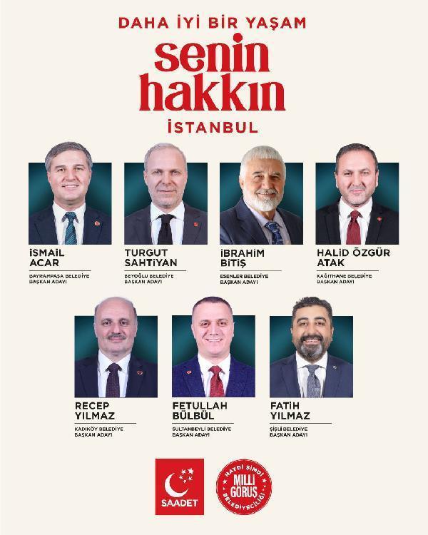 ANKARA, (DHA) SAADET Partisi, İstanbul’daki Beyoğlu, Bayrampaşa, Kadıköy, Kağıthane, Şişli, Sultanbeyli ve Esenler ilçelerindeki belediye başkan adaylarını açıkladı.