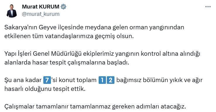 Çevre, Şehircilik ve İklim Değişikliği Bakanı Murat Kurum, Sakarya'nın Geyve ilçesinde çıkan orman yangınıyla ilgili sosyal medya hesabından açıklama yaptı. Kurum, "Sakarya'nın Geyve ilçesinde meydana gelen orman yangınından etkilenen tüm vatandaşlarımıza geçmiş olsun. Yapı İşleri Genel Müdürlüğü ekiplerimiz yangının kontrol altına alındığı alanlarda hasar tespit çalışmalarına başladı. Şu ana kadar 7'si konut toplam 12 bağımsız bölümün yıkık ve ağır hasarlı olduğunu tespit ettik. Çalışmalar tamamlanır tamamlanmaz gereken adımları atacağız" dedi. (DHA)