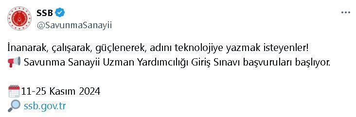 SSB'nin sosyal medya hesabından yapılan açıklamaya göre; Savunma Sanayii Uzman Yardımcılığı Giriş Sınavı başvuruları başladı. Dün itibarıyla başlayan başvurular için son tarih 25 Kasım 2024. Başvuru işlemleri, https://isbasvurusu.ssb.gov.tr/sayfalar/Default.aspx adresi üzerinden gerçekleştirilebilecek. (DHA)