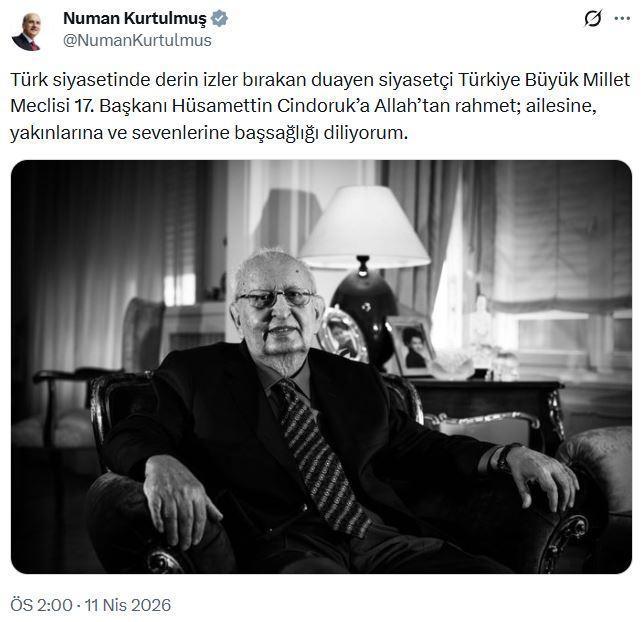 TBMM Başkanı Numan Kurtulmuş, eski Meclis Başkanı Hüsamettin Cindoruk'un vefatına ilişkin sanal medya hesabından taziye mesajı paylaştı. Kurtulmuş mesajında, "Türk siyasetinde derin izler bırakan duayen siyasetçi, Türkiye Büyük Millet Meclisi 17'nci Başkanı Hüsamettin Cindoruk’a Allah’tan rahmet; ailesine, yakınlarına ve sevenlerine başsağlığı diliyorum" dedi. (DHA)