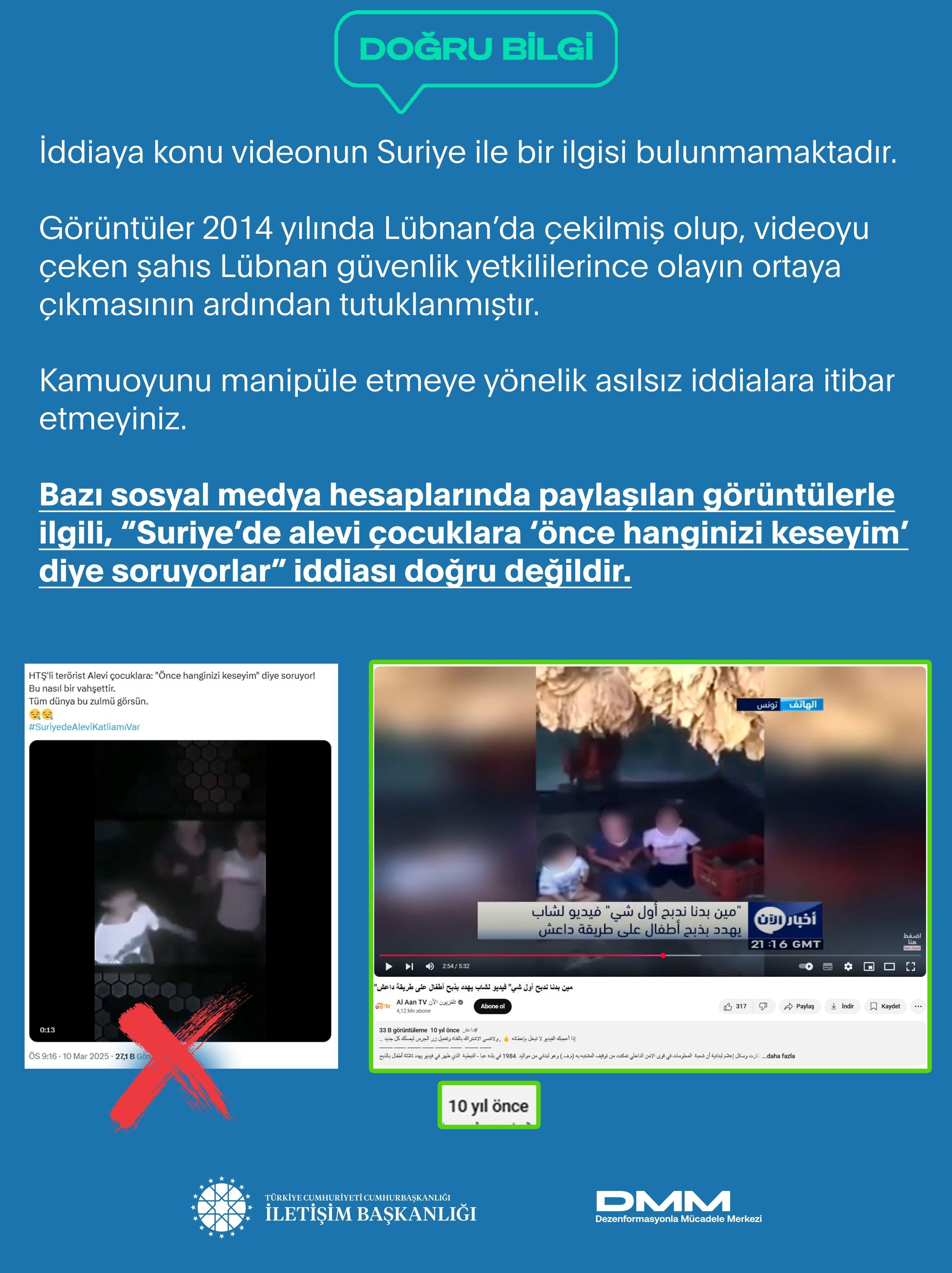 DMM tarafından, sosyal medyada yer alan ve Suriye'de çekildiği iddia edilen videoya ilişkin açıklama yapıldı. Açıklamada, "Suriye’de Alevi çocuklara 'önce hanginizi keseyim' diye soruyorlar iddiası doğru değildir. İddiaya konu videonun Suriye ile bir ilgisi bulunmamaktadır. Görüntüler 2014 yılında Lübnan’da çekilmiş olup, videoyu çeken şahıs Lübnan güvenlik yetkililerince olayın ortaya çıkmasının ardından tutuklanmıştır. Kamuoyunu manipüle etmeye yönelik asılsız iddialara itibar etmeyiniz" denildi. (DHA)