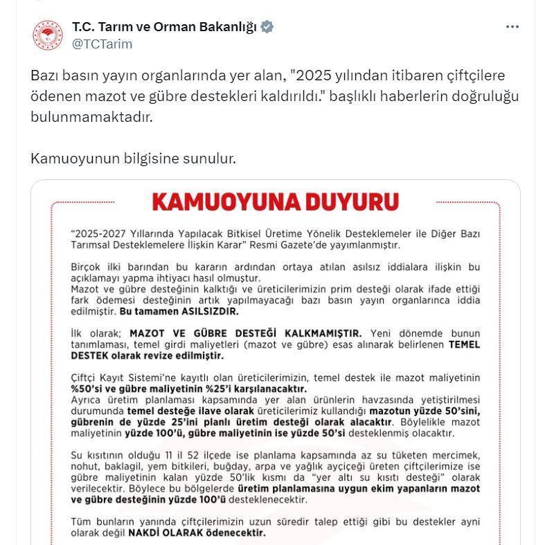Bakanlığın sosyal medya hesabından yapılan açıklamada, '2025-2027 Yıllarında Yapılacak Bitkisel Üretime Yönelik Desteklemeler ile Diğer Bazı Tarımsal Desteklemelere İlişkin Karar'ın bugün Resmi Gazete'de yayımlandığı hatırlatarak, birçok ilki barından bu kararın ardından ortaya bazı asılsız iddialar atıldığı belirtildi. Bazı basın yayın organlarında; mazot ve gübre desteğinin kalktığı ve üreticilerin 'prim desteği' olarak ifade ettiği fark ödemesi desteğinin artık yapılmayacağının iddia edildiği ancak bunun tamamen asılsız olduğu vurgulanarak, "İlk olarak; mazot ve gübre desteği kalkmamıştır. Yeni dönemde bunun tanımlaması, temel girdi maliyetleri (mazot ve gübre) esas alınarak belirlenen 'Temel Destek' olarak revize edilmiştir. Çiftçi Kayıt Sistemi'ne kayıtlı olan üreticilerimizin, temel destek ile mazot maliyetinin yüzde 50'si ve gübre maliyetinin yüzde 25'i karşılanacaktır. Ayrıca üretim planlaması kapsamında yer alan ürünlerin havzasında yetiştirilmesi durumunda temel desteğe ilave olarak üreticilerimiz kullandığı mazotun yüzde 50'sini, gübrenin de yüzde 25'ini planlı üretim desteği olarak alacaktır. Böylelikle mazot maliyetinin yüzde 100'ü, gübre maliyetinin ise yüzde 50'si desteklenmiş olacaktır" denildi.