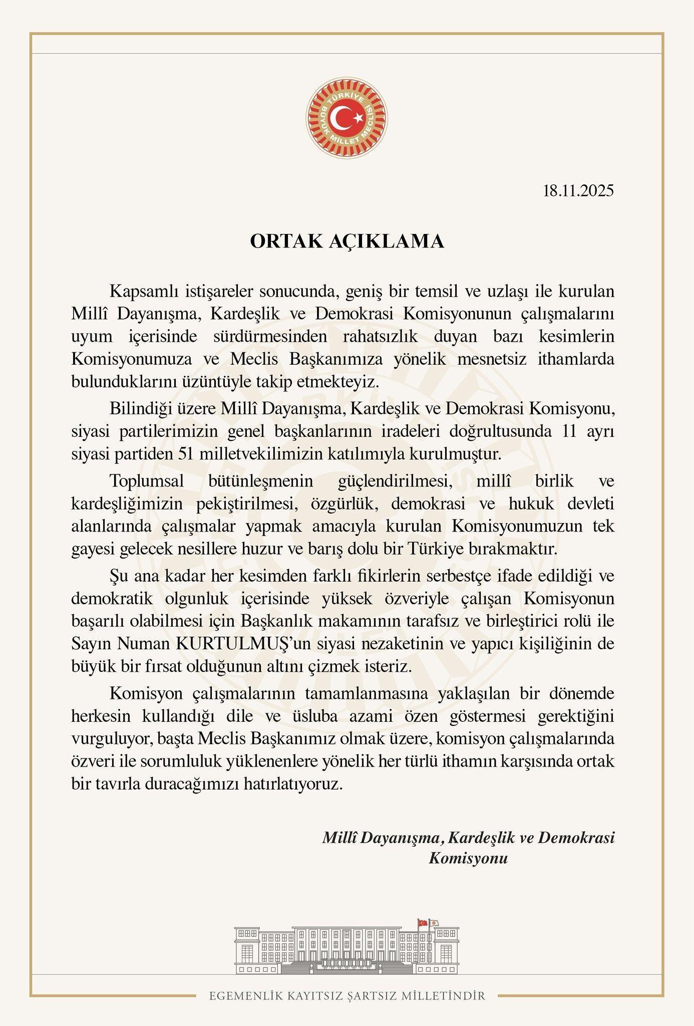"Kapsamlı istişareler sonucunda, geniş bir temsil ve uzlaşı ile kurulan Milli Dayanışma, Kardeşlik ve Demokrasi Komisyonunun çalışmalarını uyum içerisinde sürdürmesinden rahatsızlık duyan bazı kesimlerin Komisyonumuza ve Meclis Başkanımıza yönelik mesnetsiz ithamlarda bulunduklarını üzüntüyle takip etmekteyiz. Bilindiği üzere Milli Dayanışma, Kardeşlik ve Demokrasi Komisyonu, siyasi partilerimizin genel başkanlarının iradeleri doğrultusunda 11 ayrı siyasi partiden 51 milletvekilimizin katılımıyla kurulmuştur. Toplumsal bütünleşmenin güçlendirilmesi, milli birlik ve kardeşliğimizin pekiştirilmesi, özgürlük, demokrasi ve hukuk devleti alanlarında çalışmalar yapmak amacıyla kurulan Komisyonumuzun tek gayesi gelecek nesillere huzur ve barış dolu bir Türkiye bırakmaktır. Şu ana kadar her kesimden farklı fikirlerin serbestçe ifade edildiği ve demokratik olgunluk içerisinde yüksek özveriyle çalışan Komisyonun başarılı olabilmesi için Başkanlık makamının tarafsız ve birleştirici rolü ile Sayın Numan Kurtulmuş’un siyasi nezaketinin ve yapıcı kişiliğinin de büyük bir fırsat olduğunun altını çizmek isteriz. Komisyon çalışmalarının tamamlanmasına yaklaşılan bir dönemde herkesin kullandığı dile ve üsluba azami özen göstermesi gerektiğini vurguluyor, başta Meclis Başkanımız olmak üzere, komisyon çalışmalarında özveri ile sorumluluk yüklenenlere yönelik her türlü ithamın karşısında ortak bir tavırla duracağımızı hatırlatıyoruz." (DHA)
