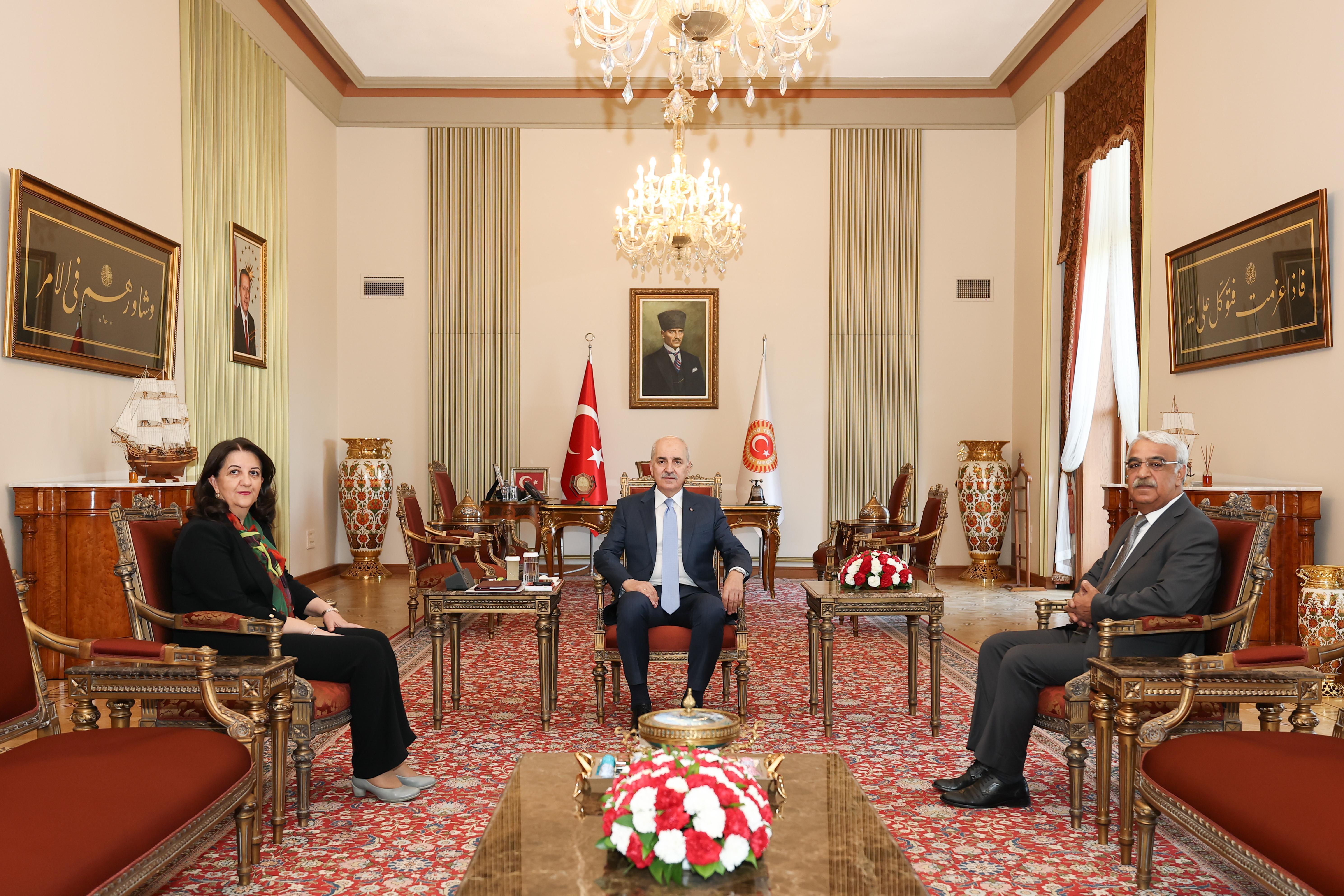 TBMM Başkanı Numan Kurtulmuş, DEM Parti heyetinde yer alan Meclis Başkan Vekili Van Milletvekili Pervin Buldan ve Şanlıurfa Milletvekili Mithat Sancar ile Meclis'teki makamında bir araya geldi. Basına kapalı gerçekleşen görüşme, yaklaşık 40 dakika sürdü. Görüşmenin ardından Buldan ve Sancar gazetecilere açıklama yaptı. Buldan, "Bu ziyaret aslında Sayın Başkan'ın yeni seçilmiş olması itibarıyla hem bir 'hayırlı olsun' ziyareti, hem de barış süreci ile ilgili gelinen aşamaları istişare etme, tartışma, konuşma ve gelinen aşamaların hangi noktada olduğuna dair görüş alışverişinde bulunduk. Oldukça olumlu ve pozitif bir çerçevede geçen görüşmemiz, yaklaşık 40 dakika sürdü. Sayın Numan Kurtulmuş'un barış sürecine dair göstermiş olduğu ilgi, alaka ve sorumluluğun çok önemli olduğunu düşünüyoruz. Dolayısıyla kendisine bu sürece göstermiş olduğu katkıdan dolayı bir kez daha teşekkür ediyoruz. Önümüzdeki günlerde kendisiyle görüşmelerimiz çok daha sık olacak, daha detaylı, daha kapsamlı görüşmeler gerçekleştireceğiz; çünkü süreç belli bir aşamaya geldi" ifadelerini kullandı.