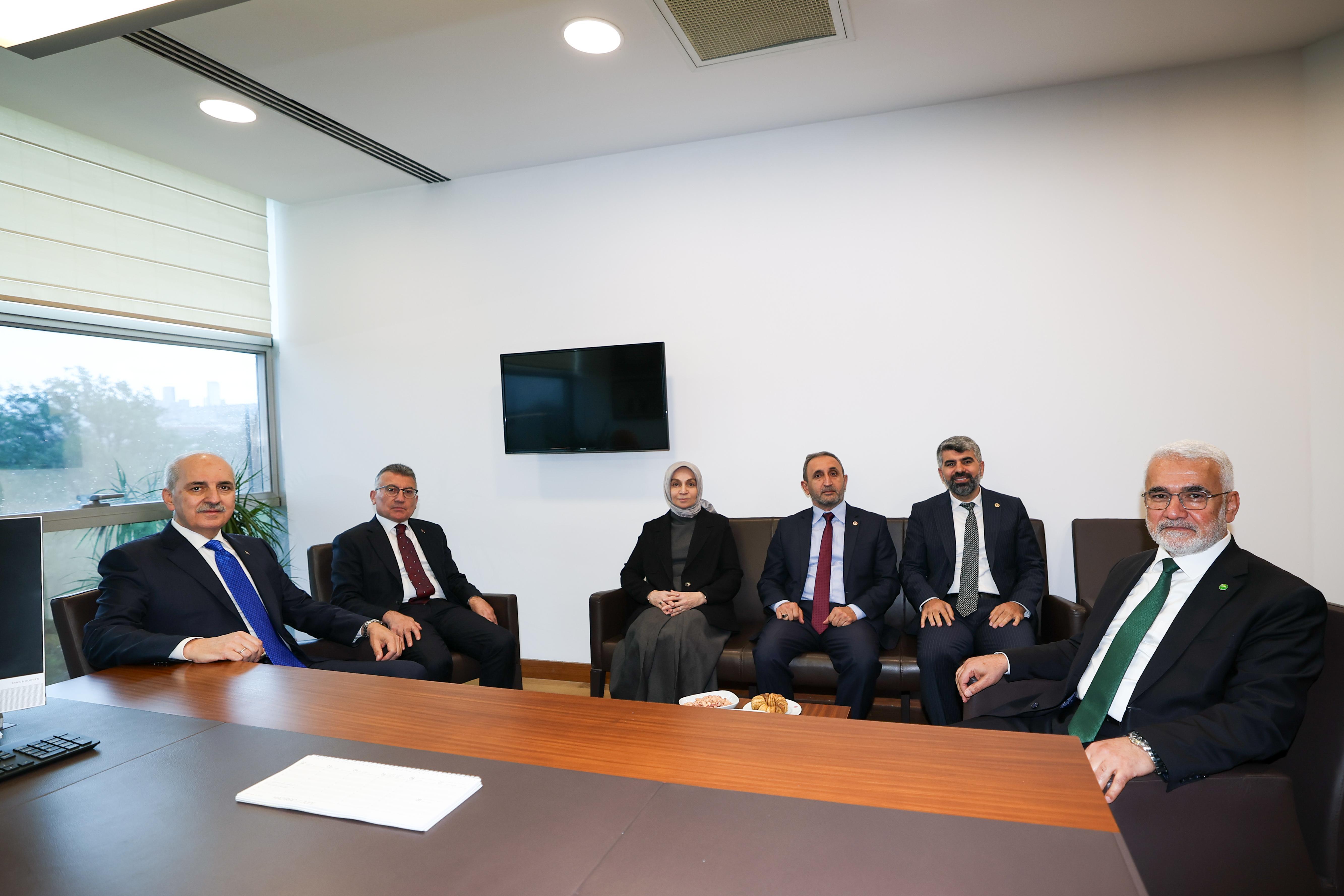 TBMM Başkanı Kurtulmuş ise Türkiye'nin genel meselelerini ele aldıklarını belirterek, "Özellikle son süreçte Türkiye'nin en önemli gündem maddelerinden birisi olan, iç kalenin tahkim edilmesi bakımından barışın, huzurun, kardeşliğin temin edilmesi için son derece önemli olan terörsüz Türkiye süreci ile ilgili karşılıklı fikir alışverişinde bulunduk. Aynı zamanda önümüzdeki dönemde TBMM'nin çalışmaları ve bu çalışmalarda takip edilebilecek usul ve yöntemler ve terörsüz Türkiye ile ilgili kurulacak komisyona ilişkin fikirlerini ve değerlendirmelerini alma imkanımız oldu. Yarın yapılacak olan TBMM Başkanlığı 28'inci Dönem Başkanlığı'nın 2'nci devresi için desteklerini talep ettik. Ben de destekleri dolayısıyla çok teşekkür ediyorum. İnşallah, TBMM'nin çalışmaları Türkiye demokrasisinin standartlarını yükselten, barışa, huzura, kardeşliğe katkı sunan bir düzen içerisinde olur" diye konuştu.