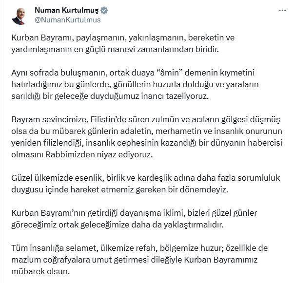 TBMM Başkanı Numan Kurtulmuş, sosyal medya hesabından paylaştığı mesajında, "Kurban Bayramı, paylaşmanın, yakınlaşmanın, bereketin ve yardımlaşmanın en güçlü manevi zamanlarından biridir. Aynı sofrada buluşmanın, ortak duaya 'amin' demenin kıymetini hatırladığımız bu günlerde, gönüllerin huzurla dolduğu ve yaraların sarıldığı bir geleceğe duyduğumuz inancı tazeliyoruz. Bayram sevincimize, Filistin'de süren zulmün ve acıların gölgesi düşmüş olsa da bu mübarek günlerin adaletin, merhametin ve insanlık onurunun yeniden filizlendiği, insanlık cephesinin kazandığı bir dünyanın habercisi olmasını Rabbimizden niyaz ediyoruz. Güzel ülkemizde esenlik, birlik ve kardeşlik adına daha fazla sorumluluk duygusu içinde hareket etmemiz gereken bir dönemdeyiz. Kurban Bayramı'nın getirdiği dayanışma iklimi, bizleri güzel günler göreceğimiz ortak geleceğimize daha da yaklaştırmalıdır. Tüm insanlığa selamet, ülkemize refah, bölgemize huzur; özellikle de mazlum coğrafyalara umut getirmesi dileğiyle Kurban Bayramımız mübarek olsun" ifadelerini kullandı. (DHA)