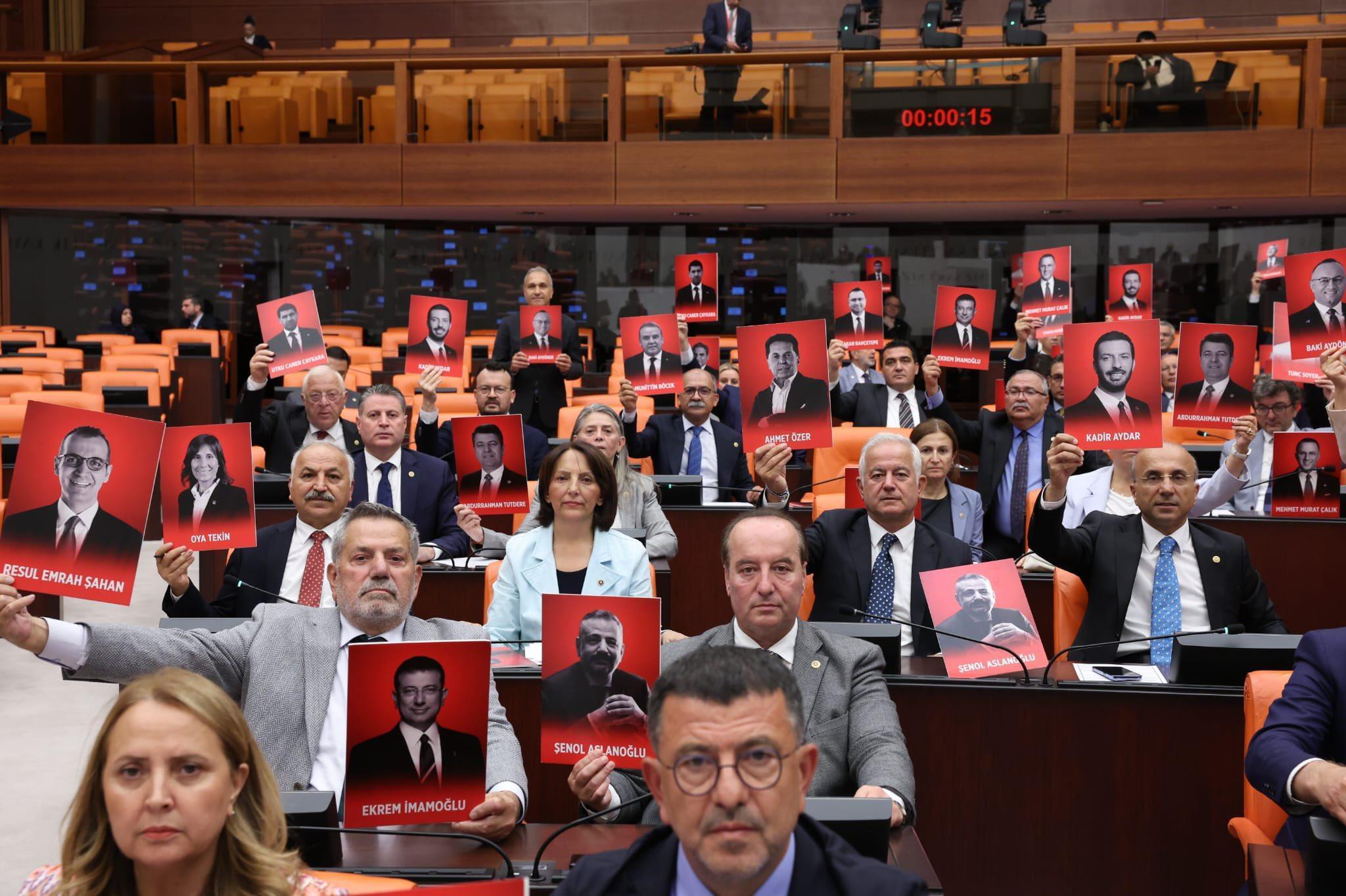 Aliekber METE/ ANKARA, (DHA)- TBMM Genel Kurulu'nda CHP'li milletvekilleri, Adana Büyükşehir Belediyesi, Antalya Büyükşehir Belediyesi ile Adıyaman Belediyesine düzenlenen operasyonları ve belediye başkanlarının tutuklanmasını protesto etti.