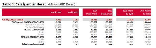 ANKARA, (DHA)-TÜRKİYE Cumhuriyet Merkez Bankası (TCMB), aralık ayında cari işlemler hesabının 7 milyar 253 milyon dolar açık kaydettiğini, yıllıklandırılmış verilere göre; aralık ayında cari açığın yaklaşık 25,2 milyar dolar olduğunu açıkladı.