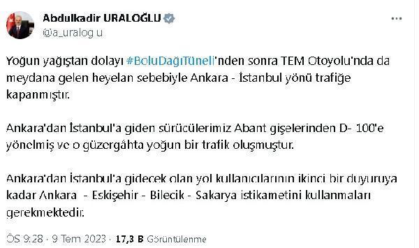 Bakan Uraloğlu, Twitter hesabından yaptığı paylaşımda, "Yoğun yağıştan dolayı Bolu Dağı Tüneli'nden sonra TEM Otoyolu'nda da meydana gelen heyelan sebebiyle Ankara - İstanbul yönü trafiğe kapanmıştır. Ankara'dan İstanbul'a giden sürücülerimiz Abant gişelerinden D-100'e yönelmiş ve o güzergâhta yoğun bir trafik oluşmuştur. Ankara'dan İstanbul'a gidecek olan yol kullanıcılarının ikinci bir duyuruya kadar Ankara- Eskişehir- Bilecik- Sakarya istikametini kullanmaları gerekmektedir" dedi. (DHA)