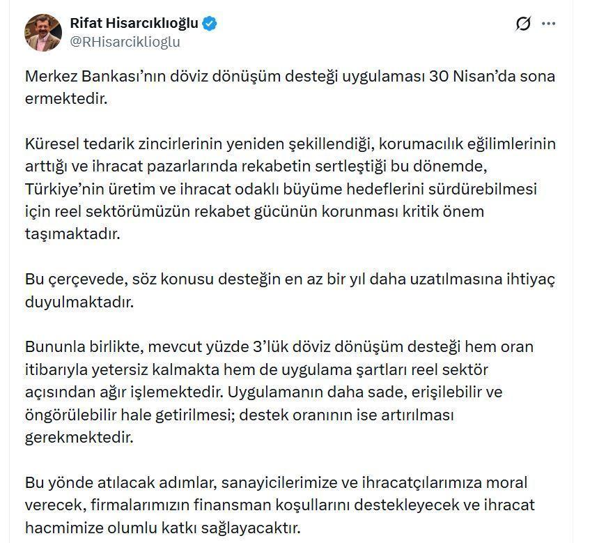 TOBB Başkanı Hisarcıklıoğlu, sanal medya hesabından yaptığı açıklamada, Türkiye Cumhuriyet Merkez Bankası'nın döviz dönüşüm desteği uygulamasının 30 Nisan'da sona ereceğini belirterek, "Küresel tedarik zincirlerinin yeniden şekillendiği, korumacılık eğilimlerinin arttığı ve ihracat pazarlarında rekabetin sertleştiği bu dönemde, Türkiye’nin üretim ve ihracat odaklı büyüme hedeflerini sürdürebilmesi için reel sektörümüzün rekabet gücünün korunması kritik önem taşımaktadır. Bu çerçevede, söz konusu desteğin en az bir yıl daha uzatılmasına ihtiyaç duyulmaktadır. Bununla birlikte, mevcut yüzde 3'lük döviz dönüşüm desteği hem oran itibarıyla yetersiz kalmakta hem de uygulama şartları reel sektör açısından ağır işlemektedir. Uygulamanın daha sade, erişilebilir ve öngörülebilir hale getirilmesi; destek oranının ise artırılması gerekmektedir. Bu yönde atılacak adımlar, sanayicilerimize ve ihracatçılarımıza moral verecek, firmalarımızın finansman koşullarını destekleyecek ve ihracat hacmimize olumlu katkı sağlayacaktır" ifadelerini kullandı. (DHA)
