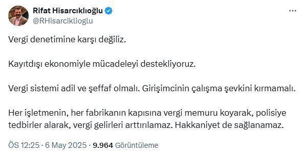 TOBB Başkanı Hisarcıklıoğlu, sosyal medya hesabından yaptığı açıklamada, "Vergi denetimine karşı değiliz. Kayıt dışı ekonomiyle mücadeleyi destekliyoruz. Vergi sistemi adil ve şeffaf olmalı. Girişimcinin çalışma şevkini kırmamalı. Her işletmenin, her fabrikanın kapısına vergi memuru koyarak, polisiye tedbirler alarak, vergi gelirleri arttırılamaz. Hakkaniyet de sağlanamaz" dedi. (DHA)