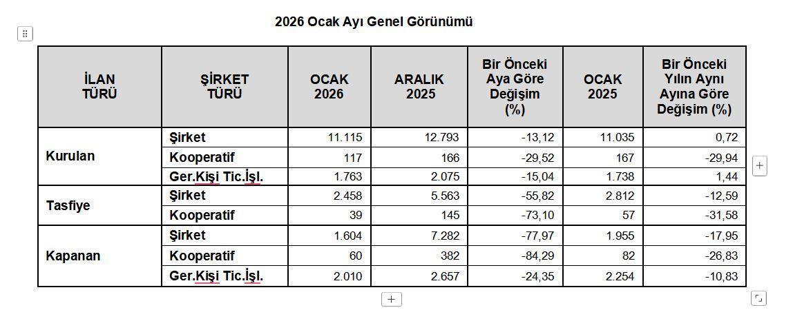 TOBB, Ocak 2026 dönemine ilişkin kurulan ve kapanan şirket istatistiklerini açıkladı. Buna göre; bir önceki aya göre kurulan şirket sayısı yüzde 13,1; kurulan kooperatif sayısı yüzde 29,5; kurulan gerçek kişi ticari işletme sayısı yüzde 15 oranında azaldı. Bir önceki aya göre kapanan şirket sayısında yüzde 78; kapanan kooperatif sayısında yüzde 84,3; kapanan gerçek kişi ticari işletme sayısında yüzde 24,4 oranında azalış oldu. Ocak 2026’da, Ocak 2025’e göre kurulan şirket sayısı yüzde 0,7; kurulan gerçek kişi ticari işletme sayısı yüzde 1,4 oranında arttı, kurulan kooperatif sayısı yüzde 29,9 azaldı. Ocak 2026’da kapanan şirket sayısı 2025 yılının aynı ayına göre yüzde 18; kapanan gerçek kişi ticari işletme sayısı yüzde 10,8; kapanan kooperatif sayısı yüzde 26,8 oranında azaldı.
