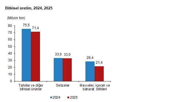 TÜİK, 2025 yılı bitkisel üretim 1'inci tahminini yayımladı. Buna göre; üretim miktarlarının, 2025 yılı ilk tahmininde bir önceki yıla göre tarla ürünleri olan tahıllar ve diğer bitkisel ürünlerde (yem bitkileri hariç) yüzde 5,3, sebzelerde yüzde 1,7, meyveler, içecek ve baharat bitkilerinde yüzde 24,4 oranında azalacağı tahmin edildi. Yaklaşık üretim miktarlarının tahıllar ve diğer bitkisel ürünlerde 71,4 milyon ton, sebzelerde 33 milyon ton, meyveler, içecek ve baharat bitkilerinde ise 21,4 milyon ton olarak gerçekleşeceği öngörüldü.