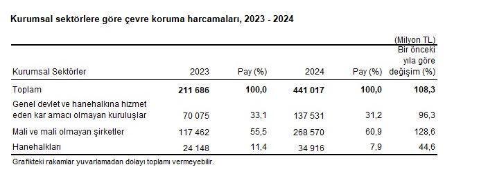 Bir önceki yıla göre yüzde 114,2 artarak toplam 82 milyar TL olarak gerçekleşen çevre koruma yatırım harcamalarının yüzde 80'i mali ve mali olmayan şirketler, yüzde 20'si genel devlet ve hanehalkına hizmet eden kar amacı olmayan kuruluşlar tarafından yapıldı. Çevre koruma harcamalarının gayrisafi yurt içi hasıla içindeki oranı 2023 yılında yüzde 0,78 iken 2024 yılında yüzde 0,99 olarak gerçekleşti. (DHA)