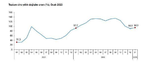 ANKARA, (DHA)- TÜRKİYE İstatistik Kurumu (TÜİK), 2023 Ocak ayında sanayi, inşaat, ticaret ve hizmet sektörleri toplamında ciro endeksinin önceki yıla göre yüzde 94, sabit fiyatlarla perakende satış hacminin de yüzde 33,9 arttığını açıkladı.
