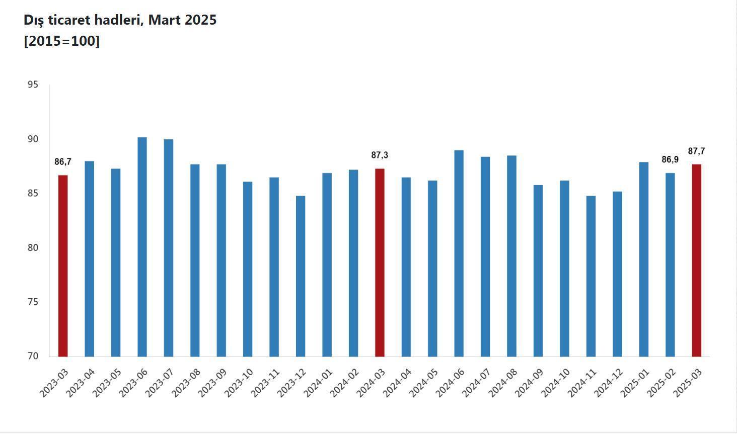 İthalat birim değer endeksi, bir önceki yılın aynı ayına göre yüzde 1,3 arttı. Endeks bir önceki yılın aynı ayına göre, gıda, içecek ve tütünde yüzde 16,2 arttı, yakıtlarda yüzde 1,2 arttı, ham maddelerde (yakıt hariç) yüzde 4,3 azaldı, imalat sanayinde (gıda, içecek, tütün hariç) yüzde 1,4 azaldı. İthalat miktar endeksi ise, bir önceki yılın aynı ayına göre yüzde 0,8 arttı. Endeks bir önceki yılın aynı ayına göre, gıda, içecek ve tütünde yüzde 8 arttı, ham maddelerde (yakıt hariç) yüzde 7,3 azaldı, yakıtlarda yüzde 5,1 arttı, imalat sanayinde (gıda, içecek, tütün hariç) yüzde 2,7 arttı. İhracat birim değer endeksinin ithalat birim değer endeksine bölünmesi ile hesaplanan dış ticaret haddi, bir önceki yılın aynı ayına göre 0,4 puan artarak 2025 yılı Mart ayında 87,7 oldu. (DHA)