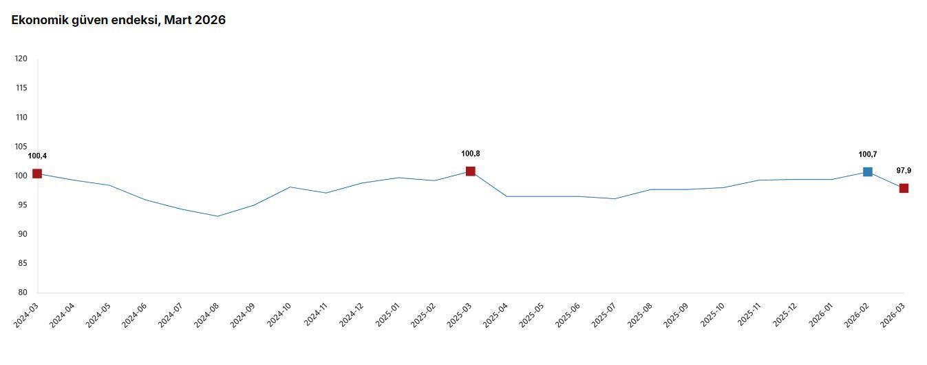 TÜİK, Mart 2026 dönemine ilişkin ekonomik güven endeksi verilerini açıkladı. Buna göre; ekonomik güven endeksi mart ayında bir önceki aya göre yüzde 2,8 oranında azalarak 97,9 değerini aldı. Bir önceki aya göre tüketici güven endeksi yüzde 0,8 oranında azalarak 85 oldu. Reel kesim (imalat sanayi) güven endeksi yüzde 3,9 oranında azalarak 100, hizmet sektörü güven endeksi yüzde 0,5 oranında azalarak 113,2, perakende ticaret sektörü güven endeksi yüzde 2 oranında azalarak 113,6, inşaat sektörü güven endeksi yüzde 3,9 oranında azalarak 80,6 değerini aldı. (DHA)
