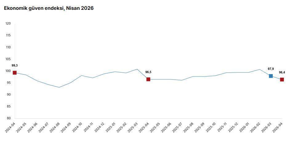 TÜİK, Nisan 2026 dönemine ilişkin ekonomik güven endeksi verilerini açıkladı. Buna göre; ekonomik güven endeksi nisan ayında bir önceki aya göre yüzde 1,5 oranında azalarak 96,4 değerini aldı. Nisan ayında tüketici güven endeksi yüzde 0,5 oranında artarak 85,5 değerini, reel kesim (imalat sanayi) güven endeksi yüzde 1,4 oranında azalarak 98,6 değerini, hizmet sektörü güven endeksi yüzde 3,1 oranında azalarak 109,7 değerini, perakende ticaret sektörü güven endeksi yüzde 1,8 oranında azalarak 111,6 değerini, inşaat sektörü güven endeksi yüzde 3,6 oranında artarak 83,6 değerini aldı. (DHA)