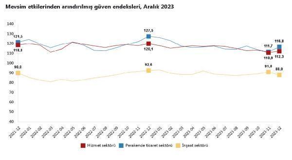 TÜİK, Aralık 2023 dönemlerine ilişkin hizmet, perakende ticaret ve inşaat güven endeksi verilerini açıkladı. Buna göre; güven endeksi aralık ayında bir önceki aya göre hizmet sektöründe yüzde 1,2 oranında artarak 112,3 değerini, perakende ticaret sektöründe yüzde 4,5 oranında artarak 116,8 değerini ve inşaat sektöründe yüzde 3,3 oranında azalarak 88 değerini aldı. (DHA)
