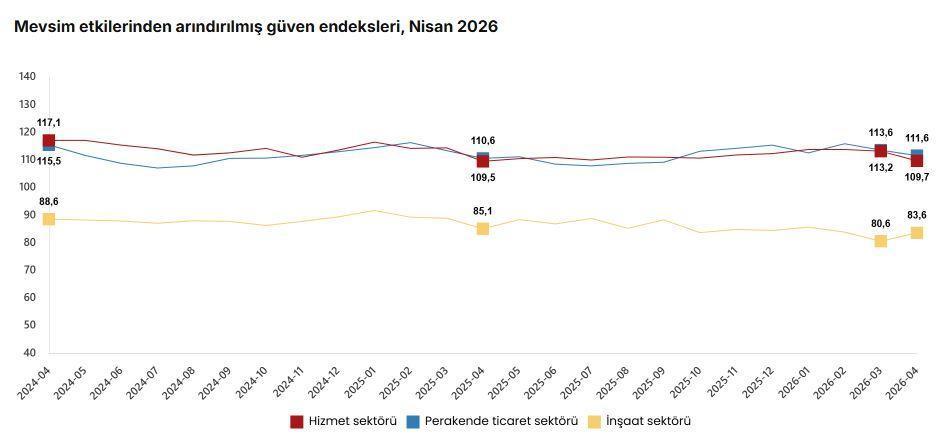 TÜİK, Nisan 2026 dönemine ilişkin hizmet, perakende ticaret ve inşaat güven endekslerini açıkladı. Buna göre; güven endeksi nisan ayında bir önceki aya göre, hizmet sektöründe yüzde 3,1 oranında azalarak 109,7 değerini, perakende ticaret sektöründe yüzde 1,8 oranında azalarak 111,6 değerini ve inşaat sektöründe yüzde 3,6 oranında artarak 83,6 değerini aldı. (DHA)