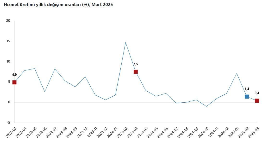 TÜİK, Mart 2025 dönemine ilişkin hizmet üretim endeksi verilerini açıkladı. Buna göre; hizmet üretimi bir önceki yılın aynı ayına göre yüzde 0,4 arttı. Aynı ayda ulaştırma ve depolama hizmetleri yüzde 1,3 azaldı, konaklama ve yiyecek hizmetleri yüzde 2,5 azaldı, bilgi ve iletişim hizmetleri yüzde 6,3 arttı, gayrimenkul hizmetleri yüzde 3,3 azaldı, mesleki, bilimsel ve teknik hizmetler yüzde 3,7 arttı, idari ve destek hizmetleri ise yüzde 2,8 arttı.