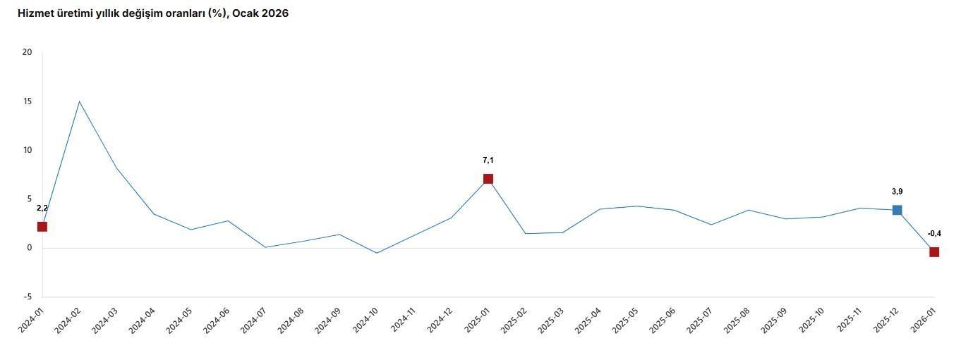 TÜİK, Ocak 2026 dönemine ilişkin hizmet üretim endeksi verilerini açıkladı. Buna göre; hizmet üretimi bir önceki yılın aynı ayına göre yüzde 0,4 azaldı. Aynı ayda ulaştırma ve depolama hizmetleri yüzde 4,7 azaldı, konaklama ve yiyecek hizmetleri yüzde 5,9 arttı, bilgi ve iletişim hizmetleri yüzde 7,5 arttı, gayrimenkul hizmetleri yüzde 1,3 azaldı, mesleki, bilimsel ve teknik hizmetler yüzde 1,8 azaldı, idari ve destek hizmetleri yüzde 0,1 arttı. Hizmet üretimi bir önceki aya göre yüzde 0,2 azaldı. Aynı ayda ulaştırma ve depolama hizmetleri yüzde 4,3 azaldı, konaklama ve yiyecek hizmetleri yüzde 0,6 arttı, bilgi ve iletişim hizmetleri yüzde 3,6 arttı, gayrimenkul hizmetleri yüzde 4,4 arttı, mesleki, bilimsel ve teknik hizmetler yüzde 5,5 arttı, idari ve destek hizmetleri yüzde 1,7 arttı. (DHA)