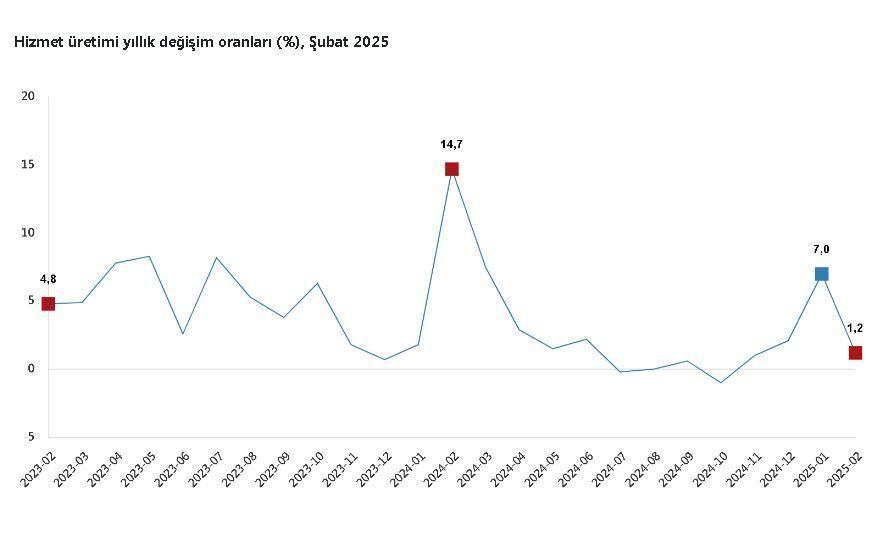 ANKARA, (DHA)- TÜRKİYE İstatistik Kurumu (TÜİK), şubat ayında hizmet üretiminin yıllık yüzde 1,2 arttığını; aylık yüzde 2 azaldığını açıkladı.