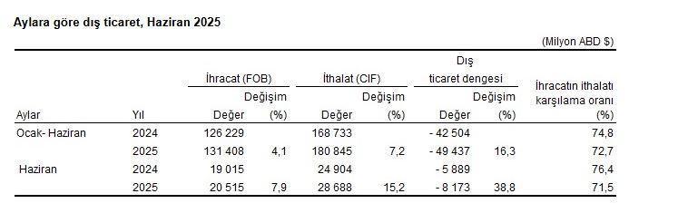 TÜİK, Haziran 2025 dönemine ilişkin dış ticaret istatistiklerini açıkladı. Buna göre; ihracat 2025 yılı Haziran ayında, bir önceki yılın aynı ayına göre yüzde 7,9 artarak 20 milyar 515 milyon dolar, ithalat yüzde 15,2 artarak 28 milyar 688 milyon dolar olarak gerçekleşti. İhracat 2025 yılı Ocak-Haziran döneminde bir önceki yılın aynı dönemine göre yüzde 4,1 artarak 131 milyar 408 milyon dolar, ithalat yüzde 7,2 artarak 180 milyar 845 milyon dolar olarak gerçekleşti.