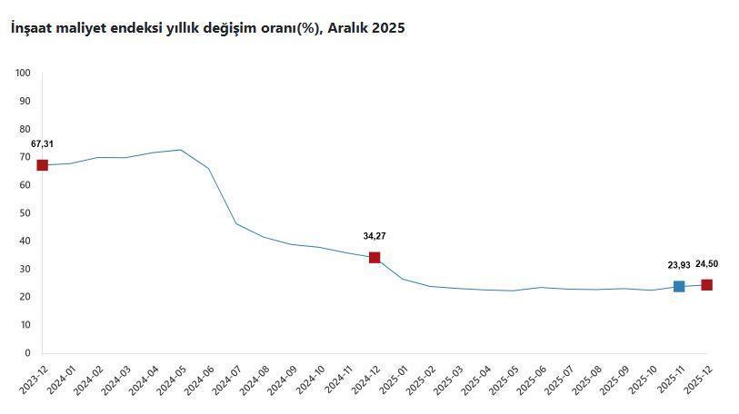 ANKARA, (DHA)- TÜRKİYE İstatistik Kurumu (TÜİK), aralık ayında inşaat maliyetinin yıllık yüzde 24,50, aylık yüzde 1,17 arttığını açıkladı.