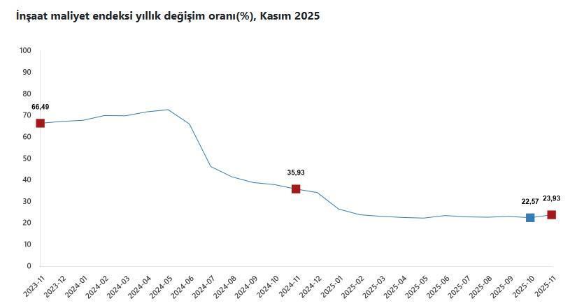 TÜİK, Kasım 2024 dönemine ilişkin inşaat maliyet endeksi verilerini açıkladı. Buna göre; inşaat maliyet endeksi, bir önceki aya göre yüzde 1,14 arttı, bir önceki yılın aynı ayına göre yüzde 23,93 arttı. Bir önceki aya göre malzeme endeksi yüzde 1,70 arttı, işçilik endeksi yüzde 0,12 arttı. Ayrıca bir önceki yılın aynı ayına göre malzeme endeksi yüzde 20,48 arttı, işçilik endeksi yüzde 30,98 arttı.