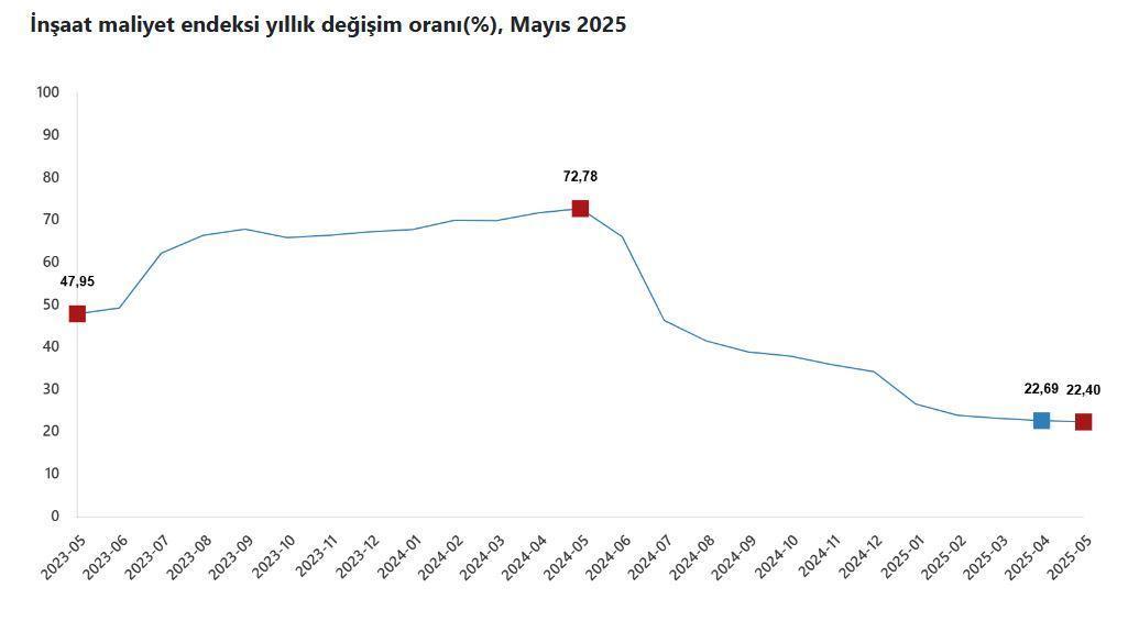 TÜİK, Mayıs 2025 dönemine ilişkin inşaat maliyet endeksi verilerini açıkladı. Buna göre; inşaat maliyet endeksi, bir önceki aya göre yüzde 0,88, bir önceki yılın aynı ayına göre yüzde 22,40 arttı. Bir önceki aya göre malzeme endeksi yüzde 1,09, işçilik endeksi yüzde 0,52 arttı. Bir önceki yılın aynı ayına göre malzeme endeksi yüzde 17,81, işçilik endeksi yüzde 31,39 arttı.