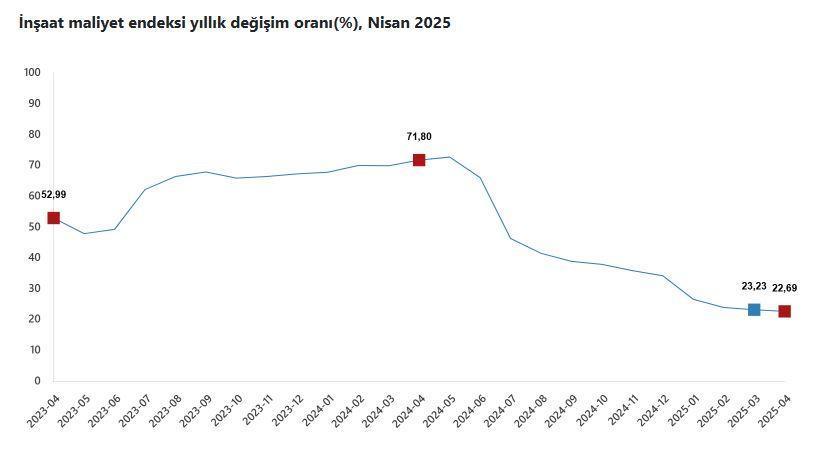 TÜİK, Nisan 2025 dönemine ilişkin inşaat maliyet endeksi verilerini açıkladı. Buna göre; inşaat maliyet endeksi, bir önceki aya göre yüzde 1,67, bir önceki yılın aynı ayına göre yüzde 22,69 arttı. Bir önceki aya göre malzeme endeksi yüzde 2,01, işçilik endeksi yüzde 1,07 arttı. Bir önceki yılın aynı ayına göre malzeme endeksi yüzde 18, işçilik endeksi yüzde 31,82 arttı. Bina inşaatı maliyet endeksi, bir önceki aya göre yüzde 1,76, bir önceki yılın aynı ayına göre yüzde 23,14 arttı. Bina dışı yapılar için inşaat maliyet endeksi ise bir önceki aya göre yüzde 1,36, bir önceki yılın aynı ayına göre yüzde 21,22 arttı. (DHA)