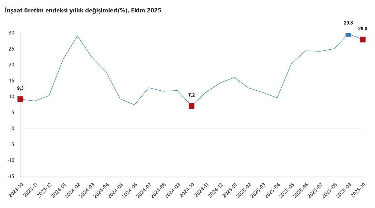 TÜİK, Ekim 2025 dönemine ilişkin inşaat üretim endeksi verilerini açıkladı. Buna göre; inşaat üretimi yıllık yüzde 28 arttı. İnşaatın alt sektörleri incelendiğinde, bina inşaatı sektörü endeksi bir önceki yılın aynı ayına göre yüzde 28,8, bina dışı yapıların inşaatı sektörü endeksi yüzde 21,8, özel inşaat faaliyetleri sektörü endeksi yüzde 29,9 arttı.