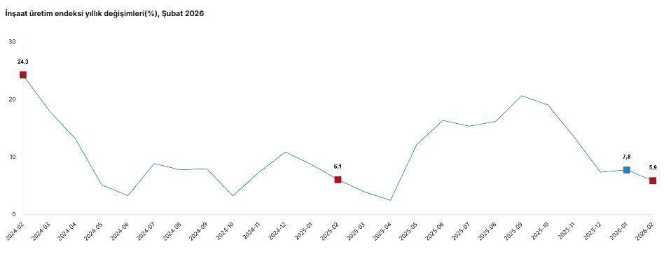 TÜİK, Şubat 2026 dönemine ilişkin inşaat üretim endeksi verilerini açıkladı. Buna göre; inşaat üretimi şubat ayında bir önceki yılın aynı ayına göre yüzde 5,9 arttı. İnşaatın alt sektörleri incelendiğinde; 2026 yılı Şubat ayında bina inşaatı sektörü endeksi bir önceki yılın aynı ayına göre yüzde 4,9 arttı, bina dışı yapıların inşaatı sektörü endeksi yüzde 12 arttı ve özel inşaat faaliyetleri sektörü endeksi yüzde 5,5 arttı. Şubat ayında inşaat üretimi bir önceki aya göre yüzde 1,3 azaldı. Alt sektörleri incelendiğinde; 2026 yılı Şubat ayında bina inşaatı sektörü endeksi bir önceki aya göre yüzde 2,5 azaldı, bina dışı yapıların inşaatı sektörü endeksi yüzde 1,2 arttı ve özel inşaat faaliyetleri sektörü endeksi yüzde 1,3 arttı. (DHA)