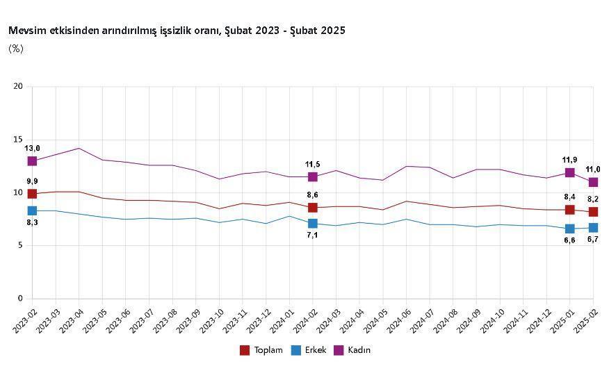 TÜİK, Şubat 2025 dönemine ilişkin iş gücü istatistiklerini açıkladı. Buna göre; 15 ve daha yukarı yaştaki kişilerde işsiz sayısı, bir önceki aya göre 95 bin kişi azalarak 2 milyon 886 bin kişi oldu. İşsizlik oranı 0,2 puan azalarak yüzde 8,2 seviyesinde gerçekleşti. İşsizlik oranı erkeklerde yüzde 6,7 iken kadınlarda yüzde 11 olarak gerçekleşti. İstihdam edilenlerin sayısı, bir önceki aya göre 149 bin kişi azalarak 32 milyon 314 bin kişi, istihdam oranı 0,3 puan azalarak yüzde 48,8 oldu. Bu oran erkeklerde yüzde 66, kadınlarda yüzde 31,9 oldu.