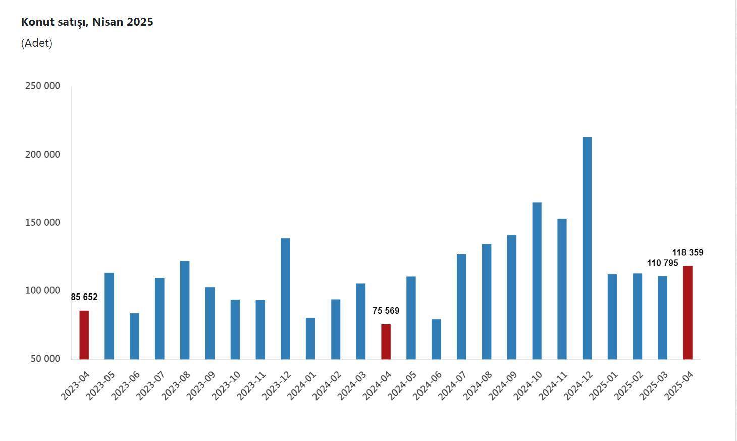 TÜİK, Nisan 2025 dönemine ilişkin konut satış istatistiklerini açıkladı. Buna göre; Türkiye genelinde konut satışları nisan ayında bir önceki yılın aynı ayına göre yüzde 56,6 oranında artarak 118 bin 359 oldu. Konut satış sayısının en fazla olduğu iller sırasıyla 18 bin 645 ile İstanbul, 10 bin 889 ile Ankara ve 7 bin 14 ile İzmir olurken, en az olduğu iller sırasıyla 37 ile Ardahan, 75 ile Tunceli ve 88 ile Bayburt olarak gerçekleşti. Konut satışları ocak-nisan döneminde bir önceki yılın aynı dönemine göre yüzde 27,9 oranında artarak 454 bin 145 olarak gerçekleşti.
