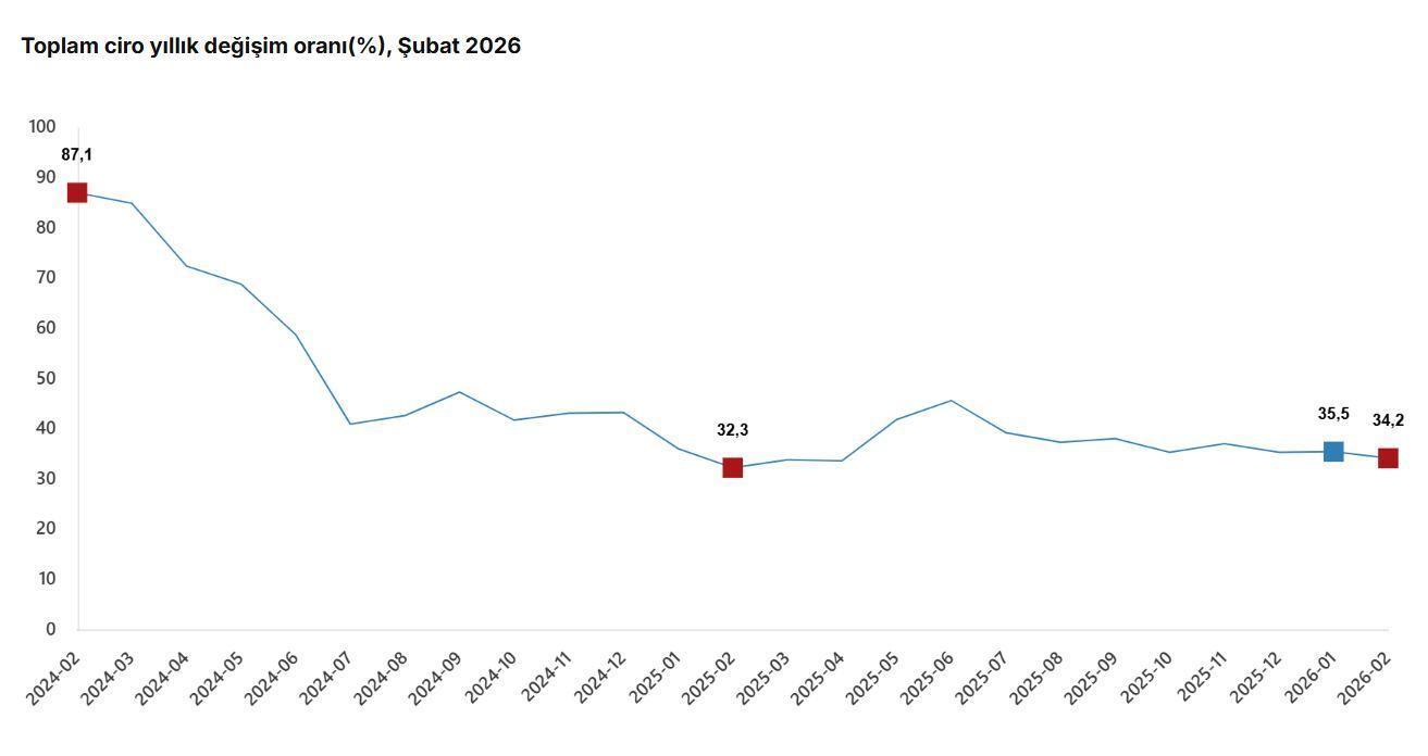 TÜİK, Şubat 2026 dönemine ilişkin ciro ve ticaret satış hacim endeksi verilerini açıkladı. Buna göre; sanayi, inşaat, ticaret ve hizmet sektörleri toplamında ciro endeksi, 2026 yılı Şubat ayında yıllık yüzde 34,2 arttı. Toplam cironun alt detaylarına bakıldığında; 2026 yılı Şubat ayında yıllık sanayi sektörü ciro endeksi yüzde 31,7 arttı, inşaat ciro endeksi yüzde 20,2 arttı, ticaret ciro endeksi yüzde 36,8 arttı, hizmet ciro endeksi yüzde 34,6 arttı.