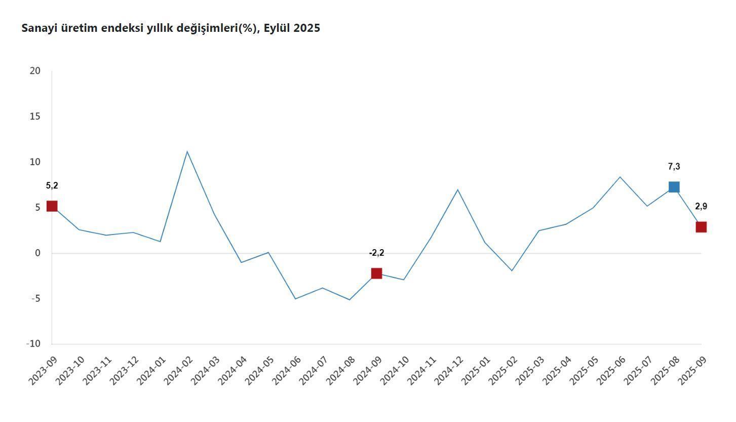 TÜİK, Eylül 2025 dönemine ilişkin sanayi üretim endeksi verilerini açıkladı. Buna göre; sanayi üretimi bir önceki yılın aynı ayına göre yüzde 2,9 arttı. Sanayinin alt sektörleri incelendiğinde, madencilik ve taş ocakçılığı sektörü endeksi bir önceki yılın aynı ayına göre yüzde 3,1 arttı, imalat sanayi sektörü endeksi yüzde 2,7 arttı ve elektrik, gaz, buhar ve iklimlendirme üretimi ve dağıtımı sektörü endeksi yüzde 5,3 arttı.