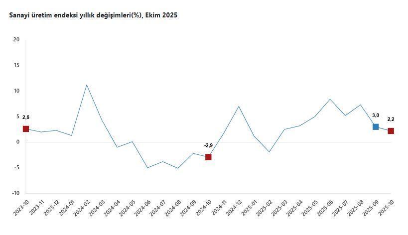 TÜİK, Ekim 2025 dönemine ilişkin sanayi üretim endeksi verilerini açıkladı. Buna göre; sanayi üretimi bir önceki yılın aynı ayına göre yüzde 2,2 arttı. Sanayinin alt sektörleri incelendiğinde, madencilik ve taş ocakçılığı sektörü endeksi bir önceki yılın aynı ayına göre yüzde 9,4 arttı, imalat sanayi sektörü endeksi yüzde 1,9 arttı ve elektrik, gaz, buhar ve iklimlendirme üretimi ve dağıtımı sektörü endeksi yüzde 0,6 arttı.