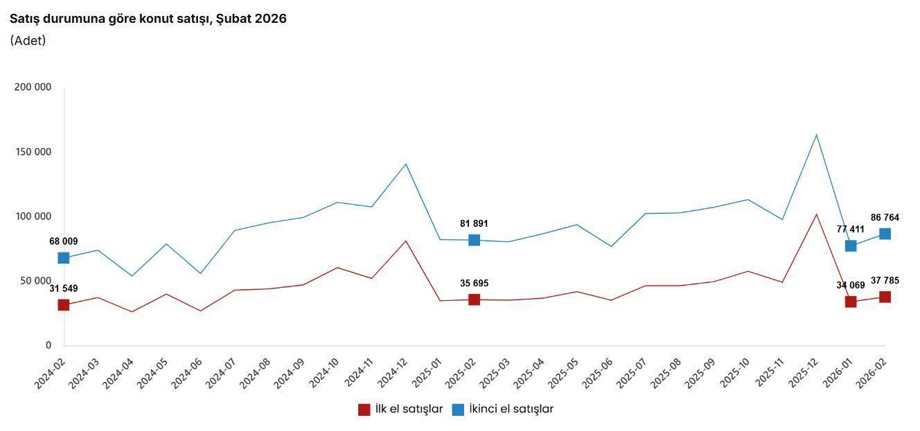 TÜİK, Şubat 2026 dönemine ilişkin konut ve iş yeri satış istatistiklerini açıkladı. Buna göre; Türkiye genelinde ilk el konut satış sayısı şubat ayında bir önceki yılın aynı ayına göre yüzde 5,9 oranında artarak 37 bin 785 oldu. İkinci el konut satışları da şubat ayında bir önceki yılın aynı ayına göre yüzde 6 oranında artarak 86 bin 764 oldu. Toplam konut satışları içinde ilk el konut satışlarının payı yüzde 30,3, ikinci el konut satışlarının payı yüzde 69,7 oldu.