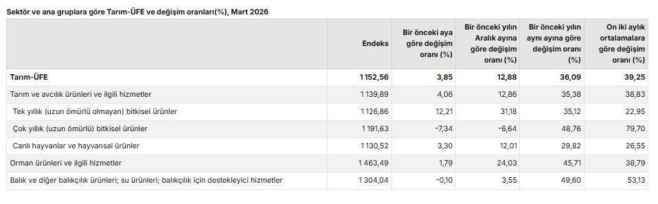 TÜİK, Mart 2026 dönemine ilişkin tarım ürünleri üretici fiyat endeksi verilerini açıkladı. Buna göre; tarım ürünleri üretici fiyatları, 2026 yılı Mart ayında bir önceki aya göre yüzde 3,85, bir önceki yılın aralık ayına göre yüzde 12,88, bir önceki yılın aynı ayına göre yüzde 36,09 ve 12 aylık ortalamalara göre yüzde 39,25 arttı. Sektörlerde bir önceki aya göre; tarım ve avcılık ürünleri ve ilgili hizmetlerde yüzde 4,06 artış, ormancılık ürünleri ve ilgili hizmetlerde yüzde 1,79 artış ve balık ve diğer balıkçılık ürünleri; su ürünleri; balıkçılık için destekleyici hizmetlerde yüzde 0,10 azalış gerçekleşti. Ana gruplarda bir önceki aya göre, tek yıllık (uzun ömürlü olmayan) bitkisel ürünlerde yüzde 12,21 artış, çok yıllık (uzun ömürlü) bitkisel ürünlerde yüzde 7,34 azalış ve canlı hayvanlar ve hayvansal ürünlerde yüzde 3,30 artış gerçekleşti. Yıllık değişimin en yüksek olduğu alt grup yüzde 56,36 artış ile diğer ağaç ve çalı meyveleri ile sert kabuklu meyveler, aylık değişimin en yüksek olduğu alt grup yüzde 20,37 artış ile sebze ve kavun-karpuz, kök ve yumrular oldu. (DHA)